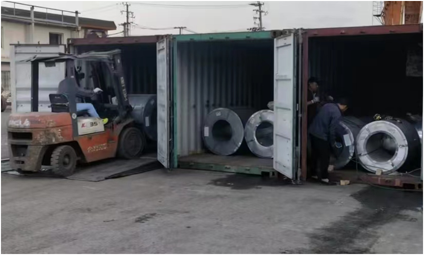 叉车端着卷钢滚进集装箱